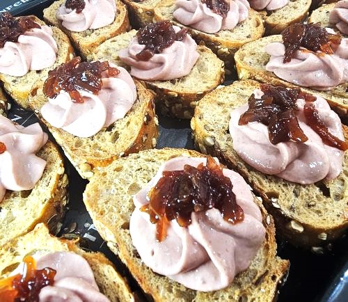 Toasted Seeded En croute, Piped with Aberdeen Pate and Caramelised Red Onion.