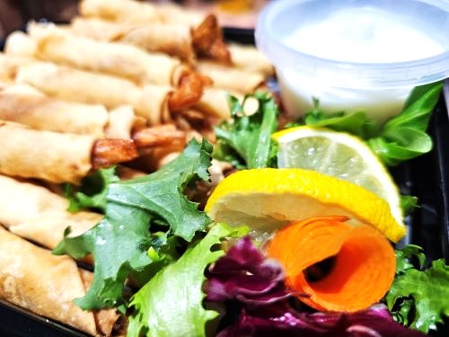 Crispy Filo Tiger Prawns, served with Thai Mayo and Lime