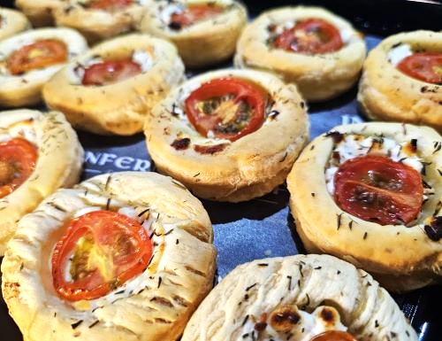 Creamy Goat’s Cheese melted with Tomato, Thyme Baked on Gluten-Free Puff Pastry.