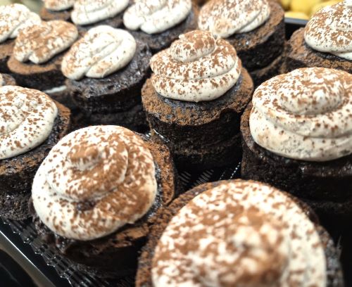 A cocoa sponge filled & finished with coffee icing & dusted with cocoa powder.